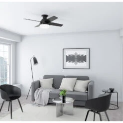 A modern fan with mass appeal, the Dempsey outdoor ceiling fan features beautiful, clean finishes that complement the angles throughout the fan design. This damp-rated fan can withstand moisture and humidity in covered outdoor spaces as well as indoor spaces. Use the included handheld remote to control the fully-dimmable, energy-efficient LED bulbs as well as fan speeds. This low profile ceiling fan’s 44-inch blade span provides style as well as optimized airflow in small rooms with low ceilings. Hunter’s Dempsey Collection features a variety of sizes and styles so you can keep a consistent look while tailoring the size and features to each room in your house.