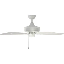 The Haven Outdoor 44 in Matte White features a 153.0 X 15.0 3-speed motor with a Twelve-degree blade pitch. The transitionally styled Haven 44 Outdoor ceiling fan has a 44″ blade sweep and is available in three finishes. Designed with a three-speed pull chain motor and manual reverse switch to optimize performance year-round. Haven is compatible with remote controls and light kits (sold separately)·Wet-rated for outdoor use.