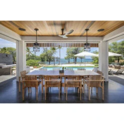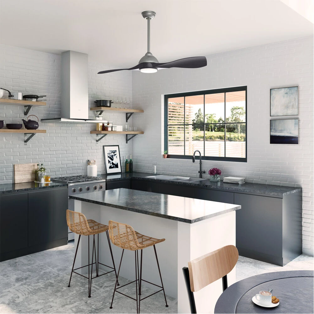 The Milstream outdoor ceiling fan features a 56-inch blade span, making it perfect for large covered patios and porches as well as cooling large indoor rooms. The unique blade shape makes a statement in modern outdoor covered spaces. The Noble Bronze finish complements dark accents and washed wood finishes in modern farmhouse spaces. The Brushed Nickel finish goes well in modern Bohemian rooms while the Matte Silver adds a finishing touch in formal modern rooms.