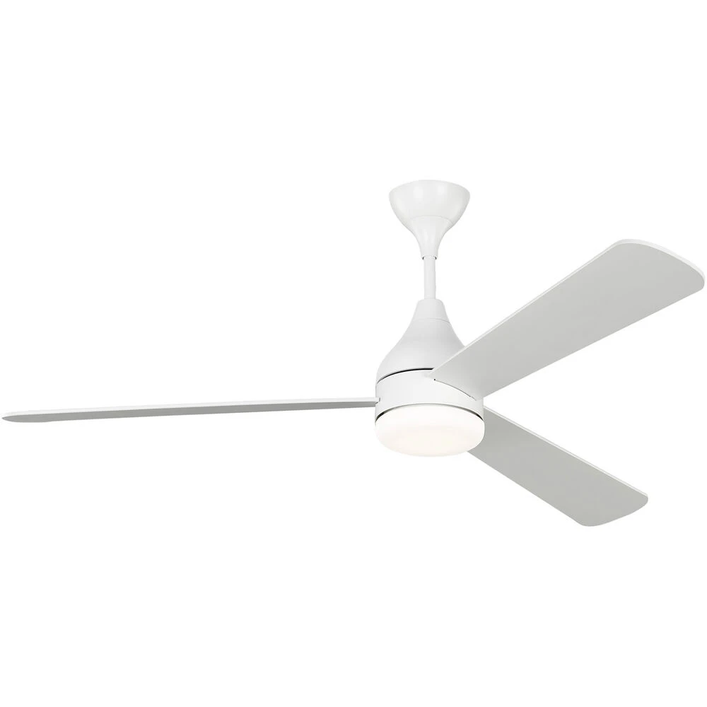 - Modern, transitional, Wi-Fi enabled, mobile device controlled, damp rated, 3-blade fan with white blades